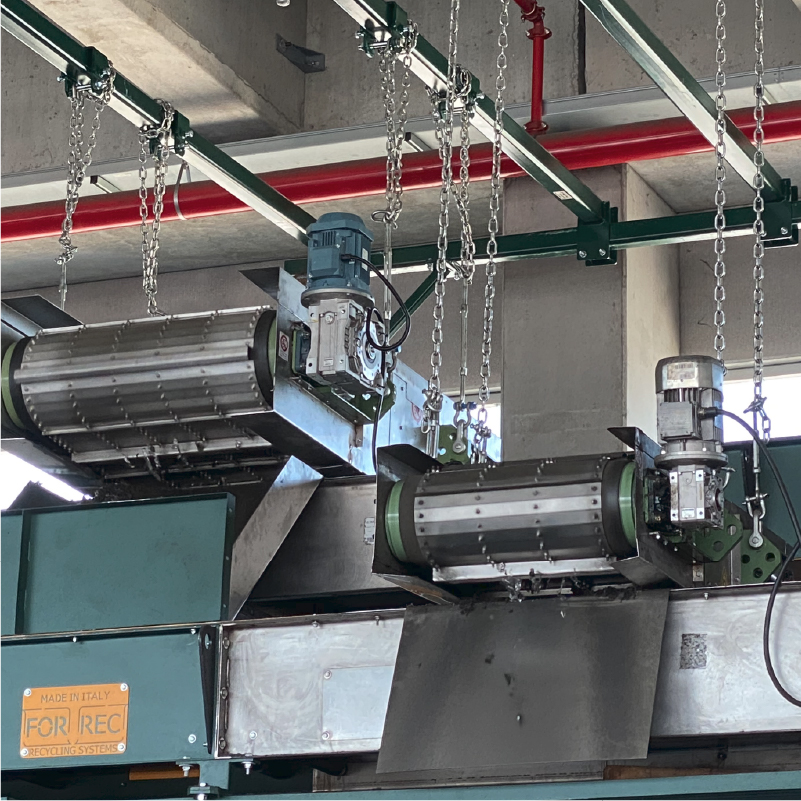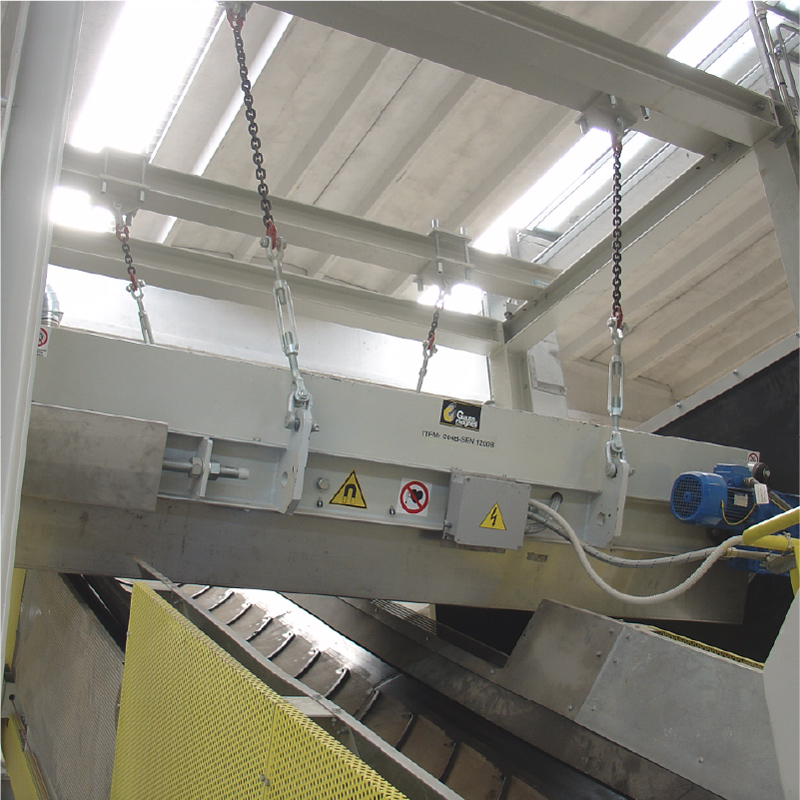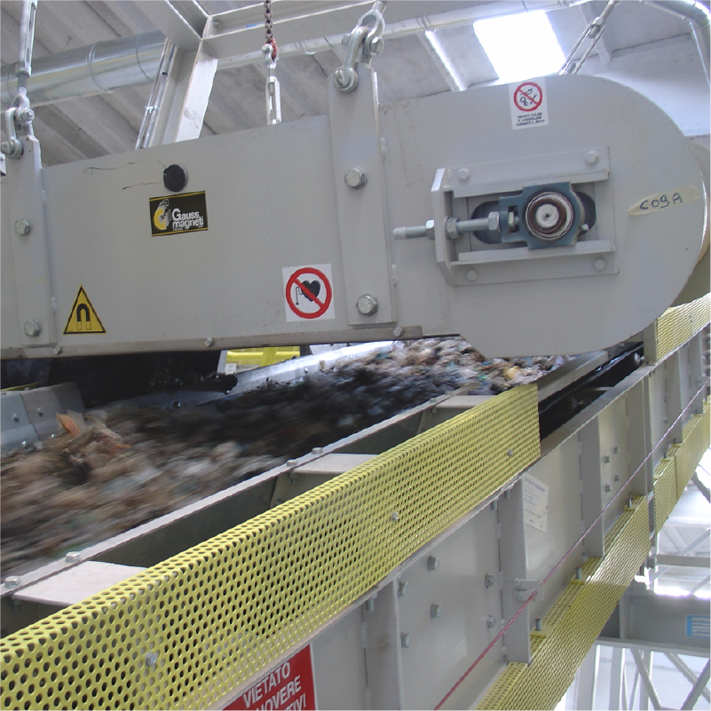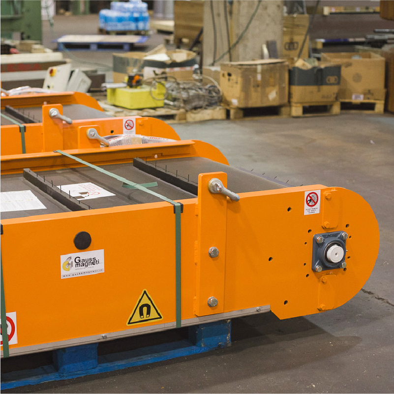 The separators equipped with this technology are available with electric or hydraulic motorization and can be installed on belts between 500mm and 2,200mm wide. This separators can be equipped with two kinds of permanent magnets: + Ferrite: widely used and resistant to high temperatures (up to 300°C), this magnet generates a deep field. + Rare earths (Neodymium alloy, iron and boron): the high magnetic induction and the very high coercive force make this magnet suitable for separating small-sized materials or materials embedded in the inert material (such as wired glass or slightly magnetic steel).