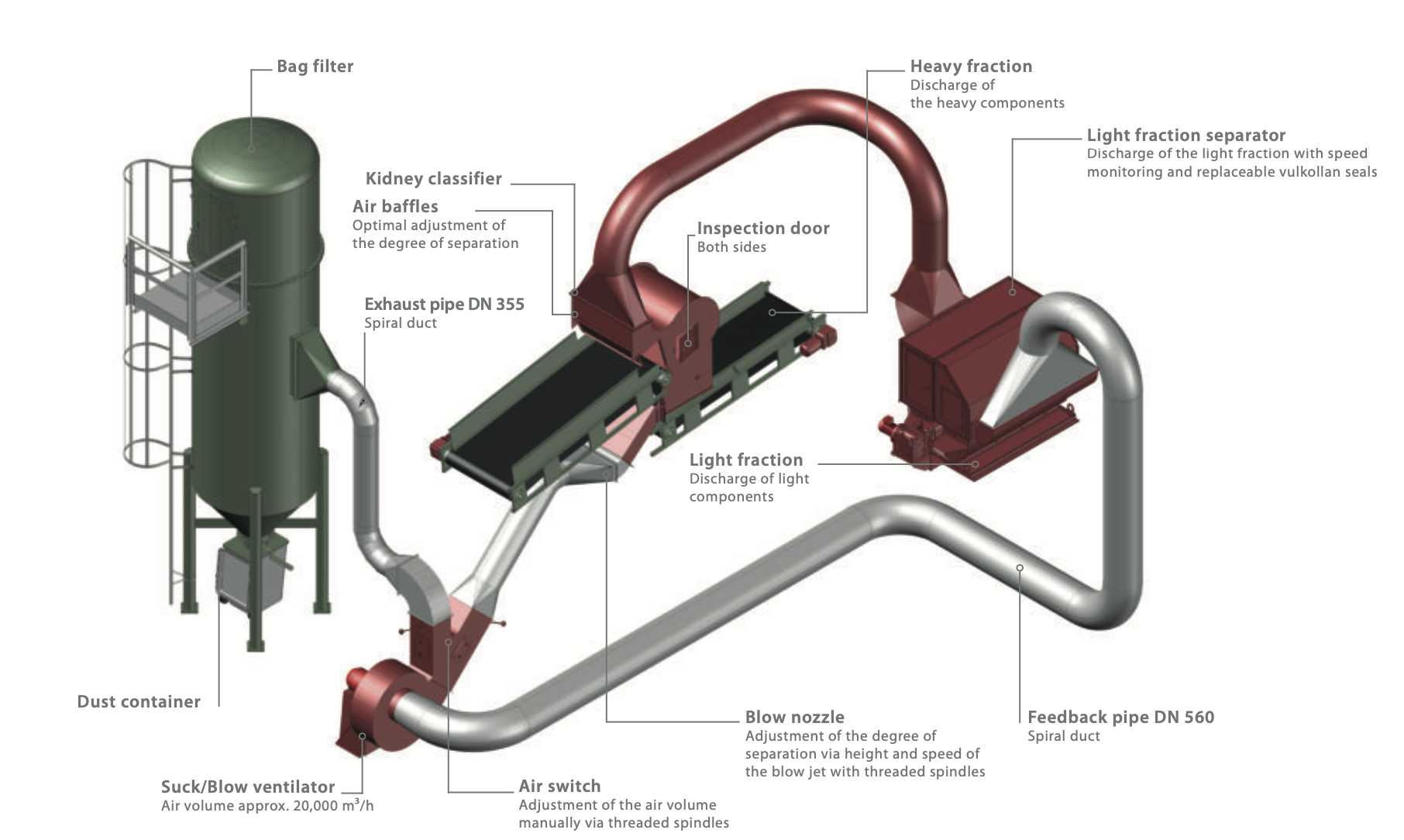 An innovative design and functionality with a cyclone- like operation enables the separation of a heterogeneous material flow, which consists of various fractions, into individual components. After successful separation the heavy fractions are transported away over conveyor belts. The light fraction is sucked away. A diverse range of setting options ensures that the kidney classifier adapts to various customer requirements. The kidney classifier can be easily integrated into existing air classifier systems in order to considerably improve their efficiency.